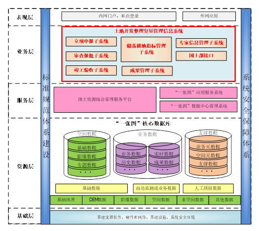 整个系统在国土资源一张图和综合监管平台的体系架构上进行建设,在数据层面上,基于同一个物理数据库进行建设;在服务层面,共享国土资源综合管理平台提供的各项基础服务,能够调用“一张图”应用服务系统提供的各类空间数据服务。在此基础上构建业务应用,实现土地开发整理复垦项目立项、验收等业务的省市县三级联网报送,具体要建设的子系统包括立项申报子系统、审查报批子系统、竣工验收子系统、储备耕地指标管理子系统、成果管理子系统、专家信息管理子系统以及实现与国土部进行数据交换的接口。