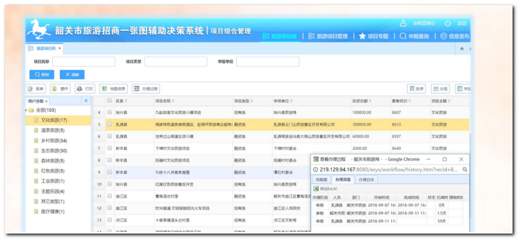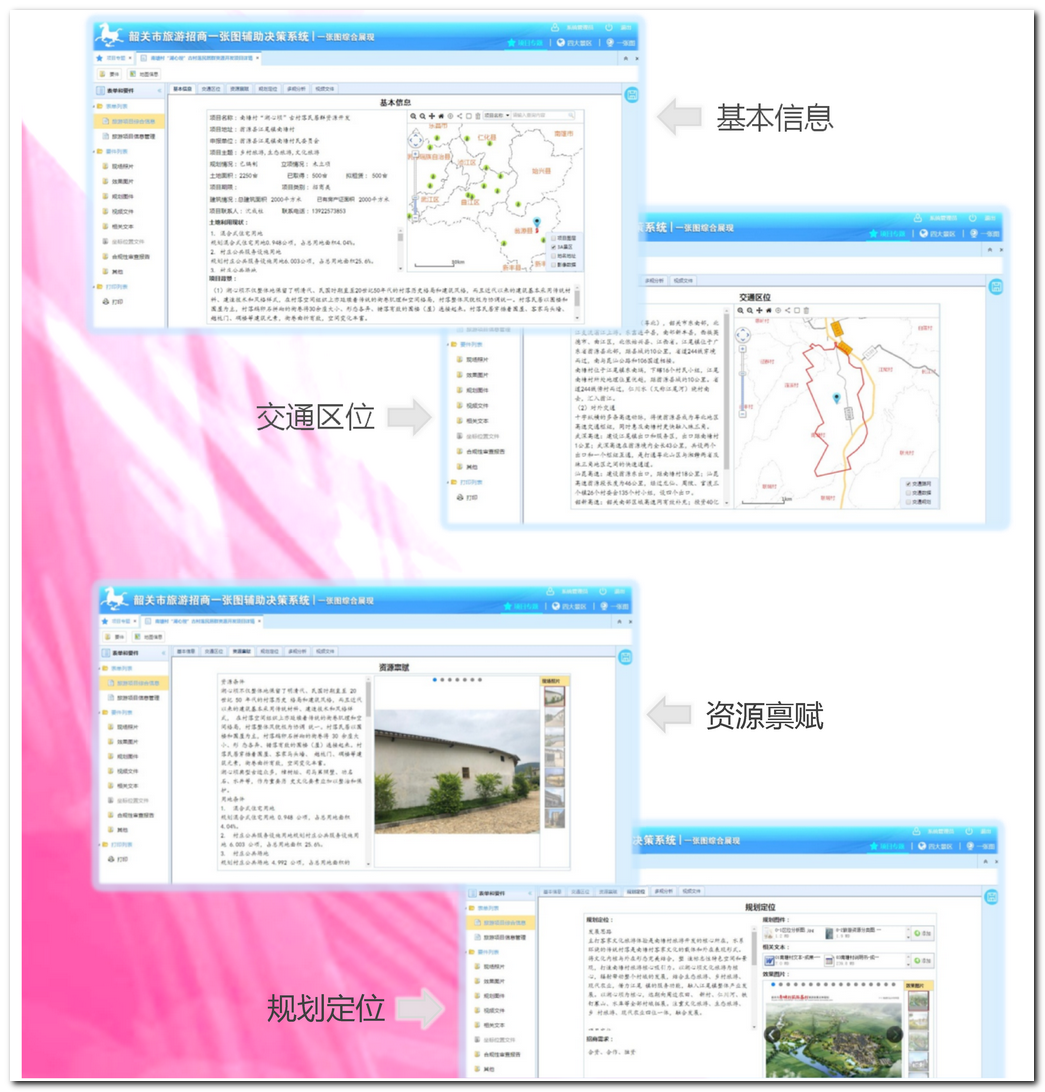 实现招商和融资项目的图、文、册、视频一体化管理,系统提供招商项目信息查询及空间快速定位功能,在招商咨询中可根据投资方要求快速定位符合条件的旅游资源项目。